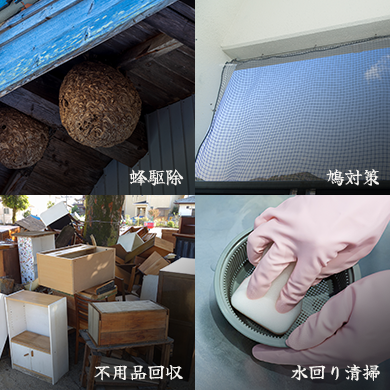 蜂の駆除から鳩の対策、不用品の回収・整理、水回りの清掃、エアコンの取付けや清掃まで、お客様の日常生活に関わるさまざまな問題を解決。当社のスタッフが、迅速かつ丁寧に対応させていただきます。